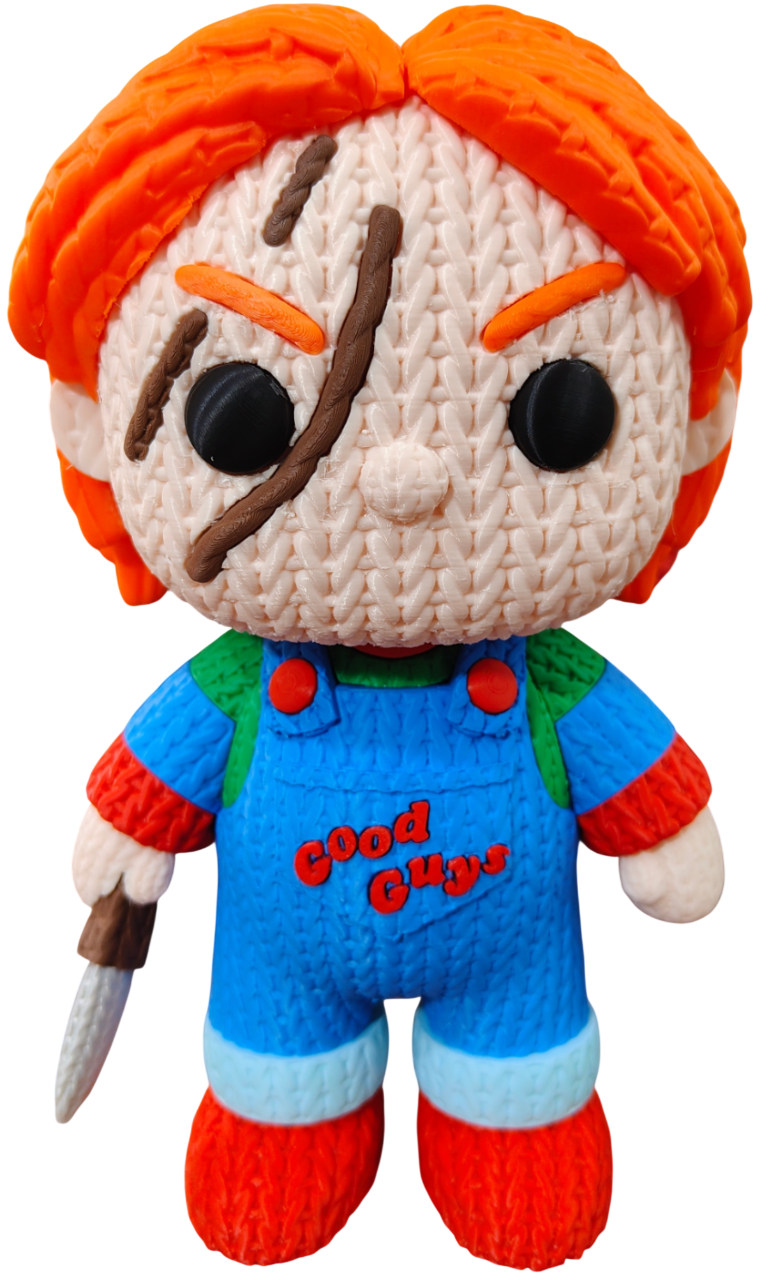 Pieza impresa en material PLA con efecto crochet, perfecta para fans.